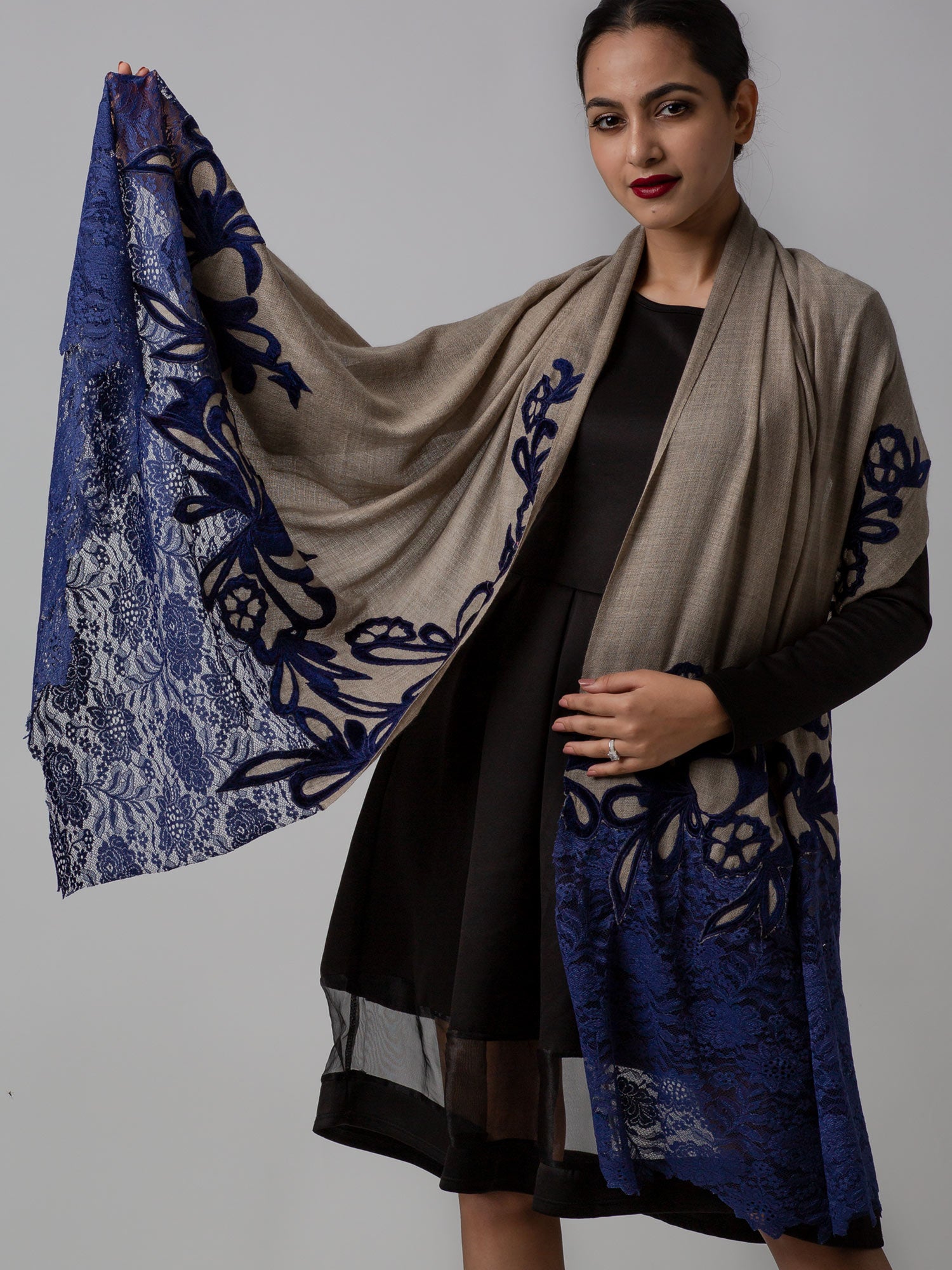 Lace Stole With Velvet Appliqué Work - Navy Blue